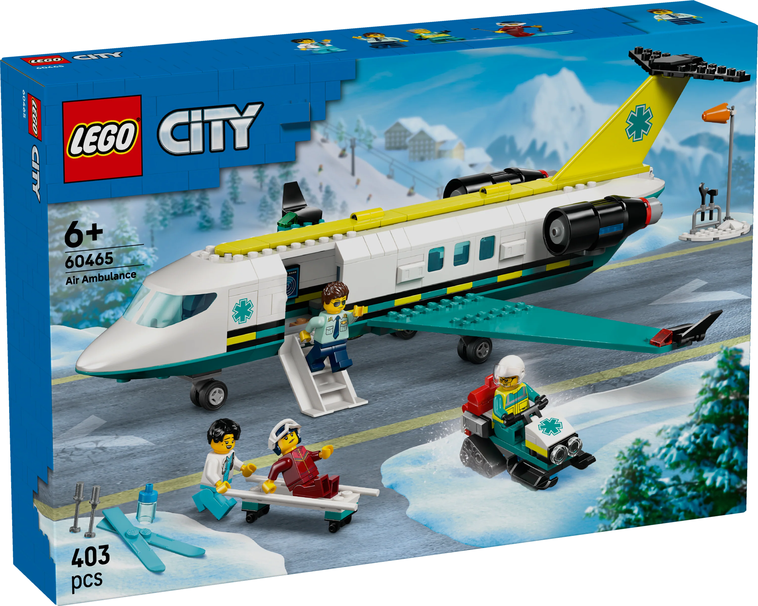 Join the crew aboard the Emergency Air Ambulance Plane and head to the mountain slopes where a skier needs urgent help. Make a perfect landing, unload the stretcher and medical equipment, hop onto the snow scooter and race to the scene. Perform health checks in the aircraft’s medical laboratory before flying the patient to safety. Soaring rescue adventures await in LEGO® City!