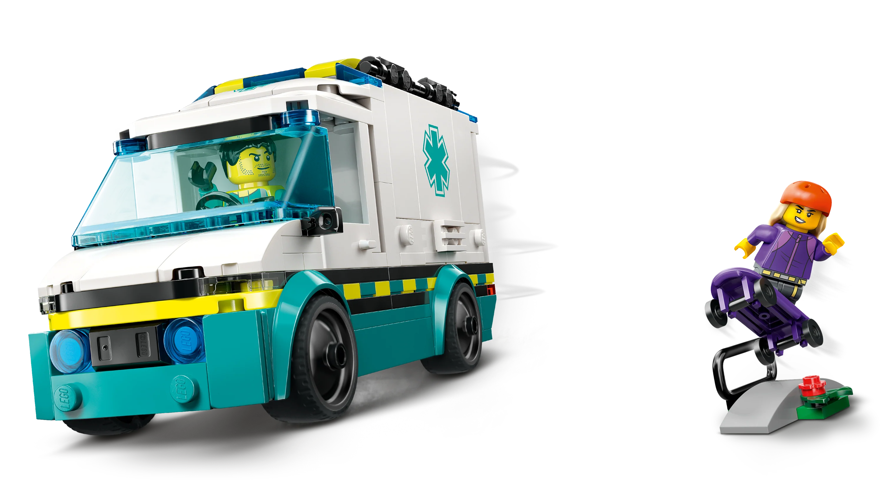 Action-packed rescue missions await with this LEGO® City Emergency Ambulance toy (60451) for ages 5 and over. Kids can fold up the side panels and open the rear doors for easy access to the onboard stretcher and medical equipment, including a toy syringe, bandage and medic bag. The set also includes a skateboard and skate ramp setting, plus skateboarder and paramedic minifigures for fun role play and storytelling.