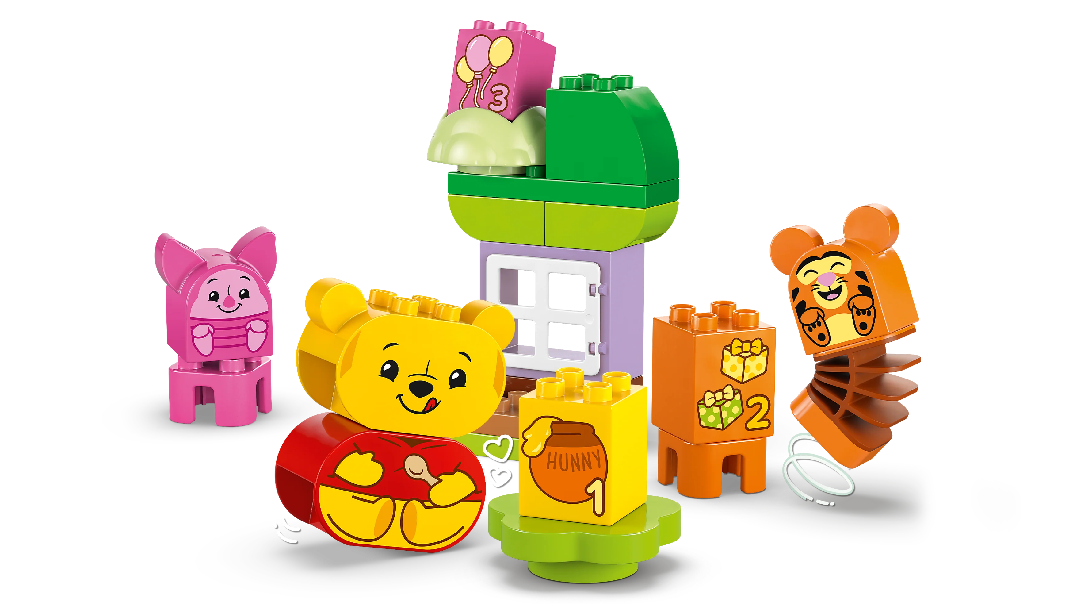 Preschoolers imagine attending a party with the 3 LEGO DUPLO figures: Winnie the Pooh, Tigger and Piglet. Each character has a double-sided face with different expressions, sparking limitless creative play and story-making. This fun feature also provides social-emotional learning activities for toddlers as they explore the different emotions toddlers can feel at parties, from the joy of opening gifts to discomfort after eating too many treats!