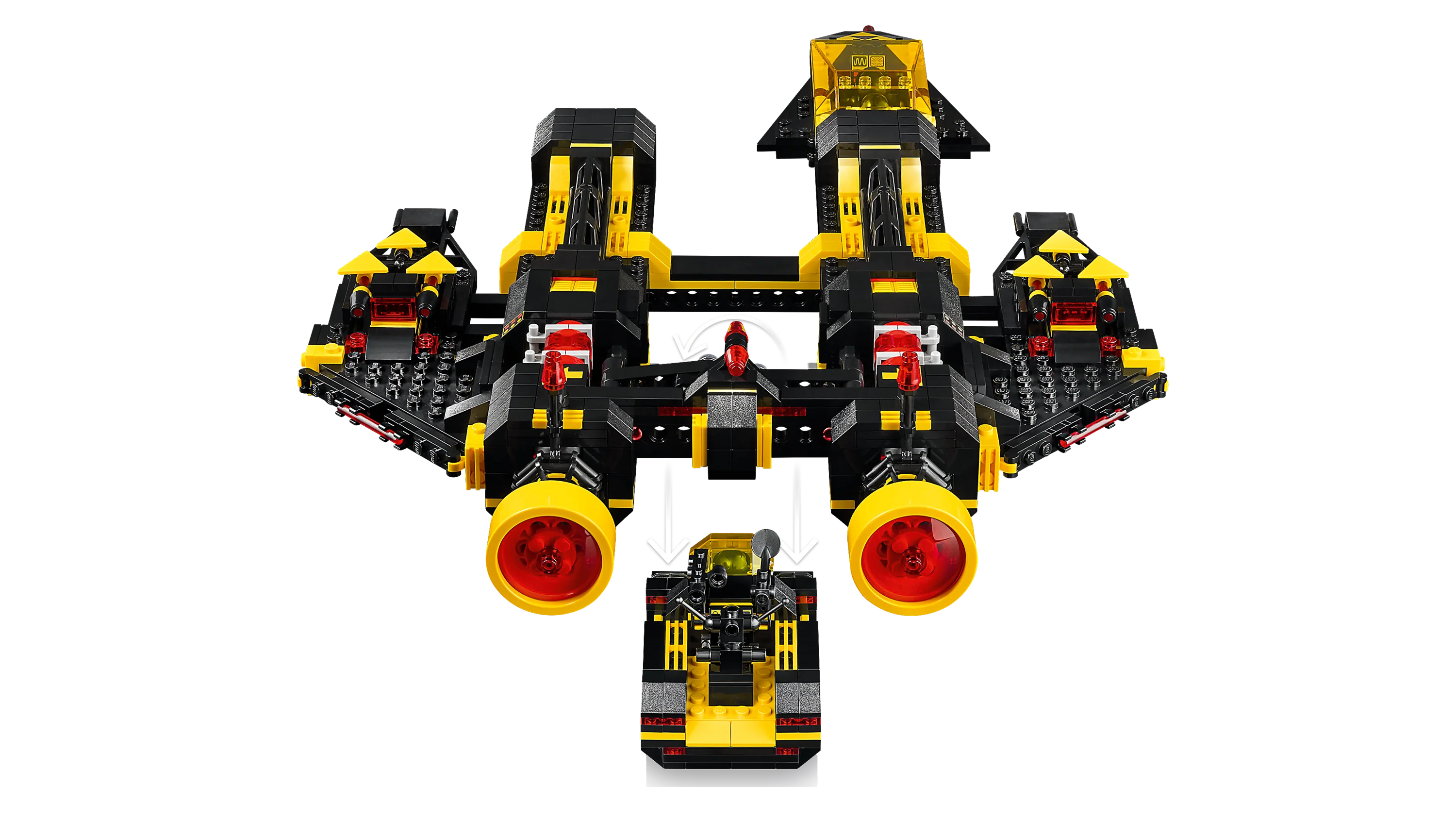 The asymmetric Blacktron Renegade spaceship is recreated in a modular design with new features, including a planet-rover drop pod, landing gear, 2 wing-mounted space speeders and 2 engine energy canisters. The model comes with 3 Blacktron minifigures and a droid figure, and it can be rebuilt, via online building instructions, into an enhanced version of the 1980s LEGO Alienator.