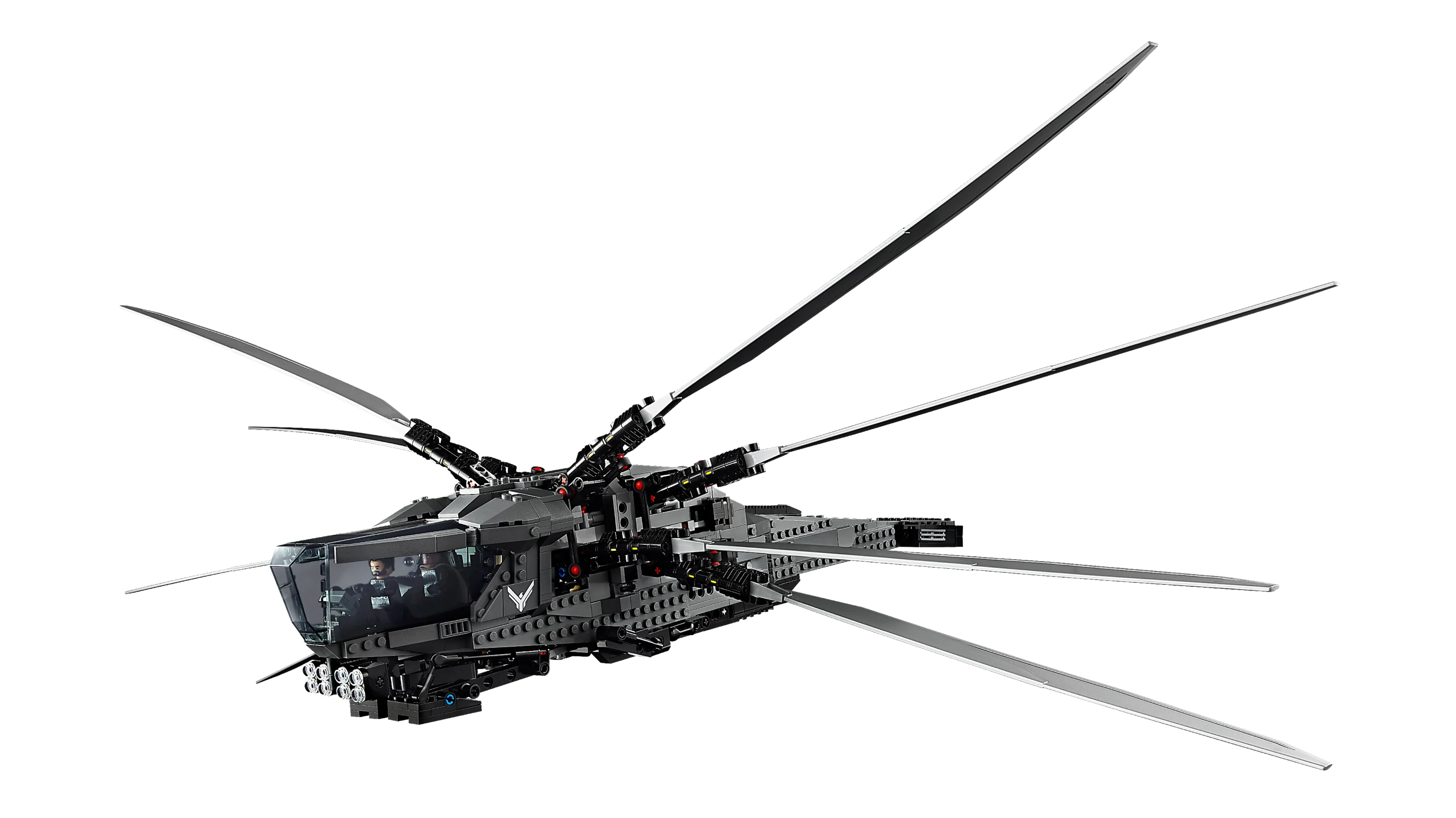 This premium-quality replica features fold-out, flappable wings, deployable landing gear and an opening cockpit. The set also includes 8 iconic characters from the film: Paul Atreides, Lady Jessica, Gurney Halleck, Chani, Leto Atreides, Liet Kynes, Duncan Idaho and Baron Harkonnen in his long robe.