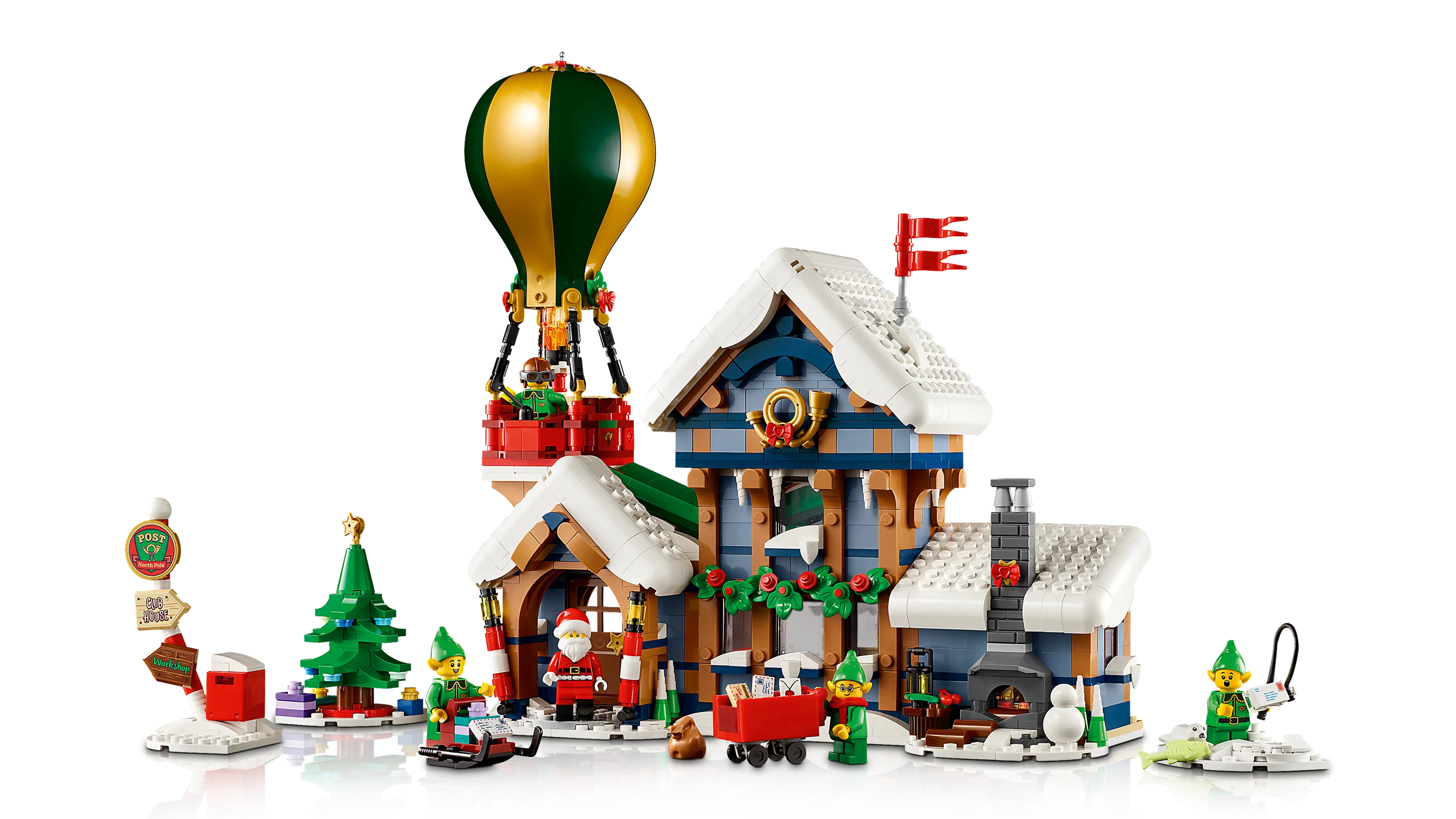The snow-topped post office houses Santa’s study complete with a cosy log fire, a postal sorting area, an entrance hall with a coffee machine and a first-floor writing area with a letter chute. Other builds include a hot-air balloon with an illuminating burner, a 2-way letter sorter, an ice-fishing scene, Christmas tree, signpost, postbox and sledge, plus a Santa minifigure and 4 elf figures.