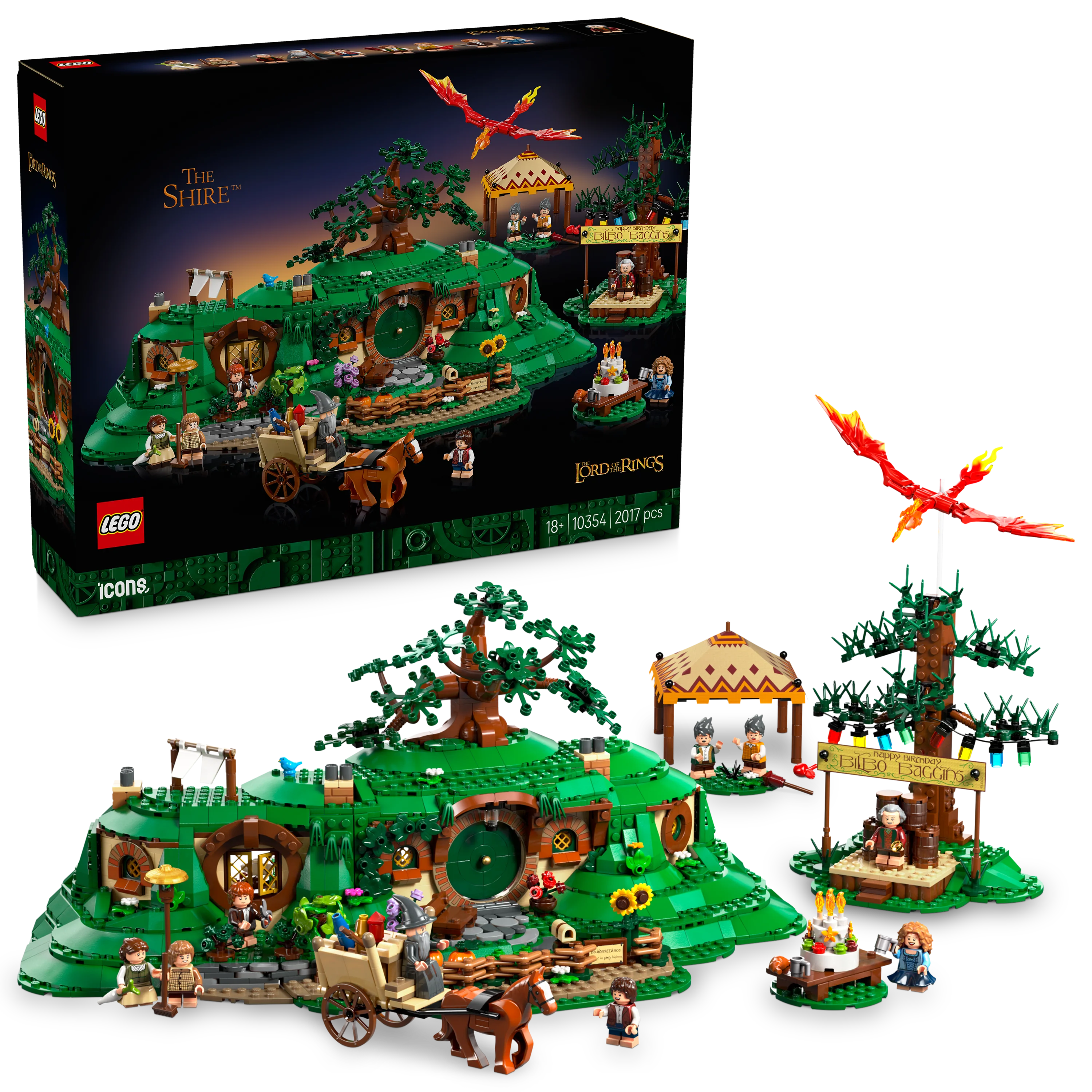 Journey to Middle-earth™ with the LEGO® Icons The Lord of the Rings: The Shire™ (10354) film memorabilia set. Bursting with features that fans will adore, this intricate diorama captures the magic of Bilbo Baggins’ eleventy-first birthday party and includes 9 film characters: Bilbo Baggins™, Frodo™, Mrs. Proudfoot, Farmer Proudfoot, Merry, Pippin, Rosie, Samwise™ and Gandalf the Grey™.