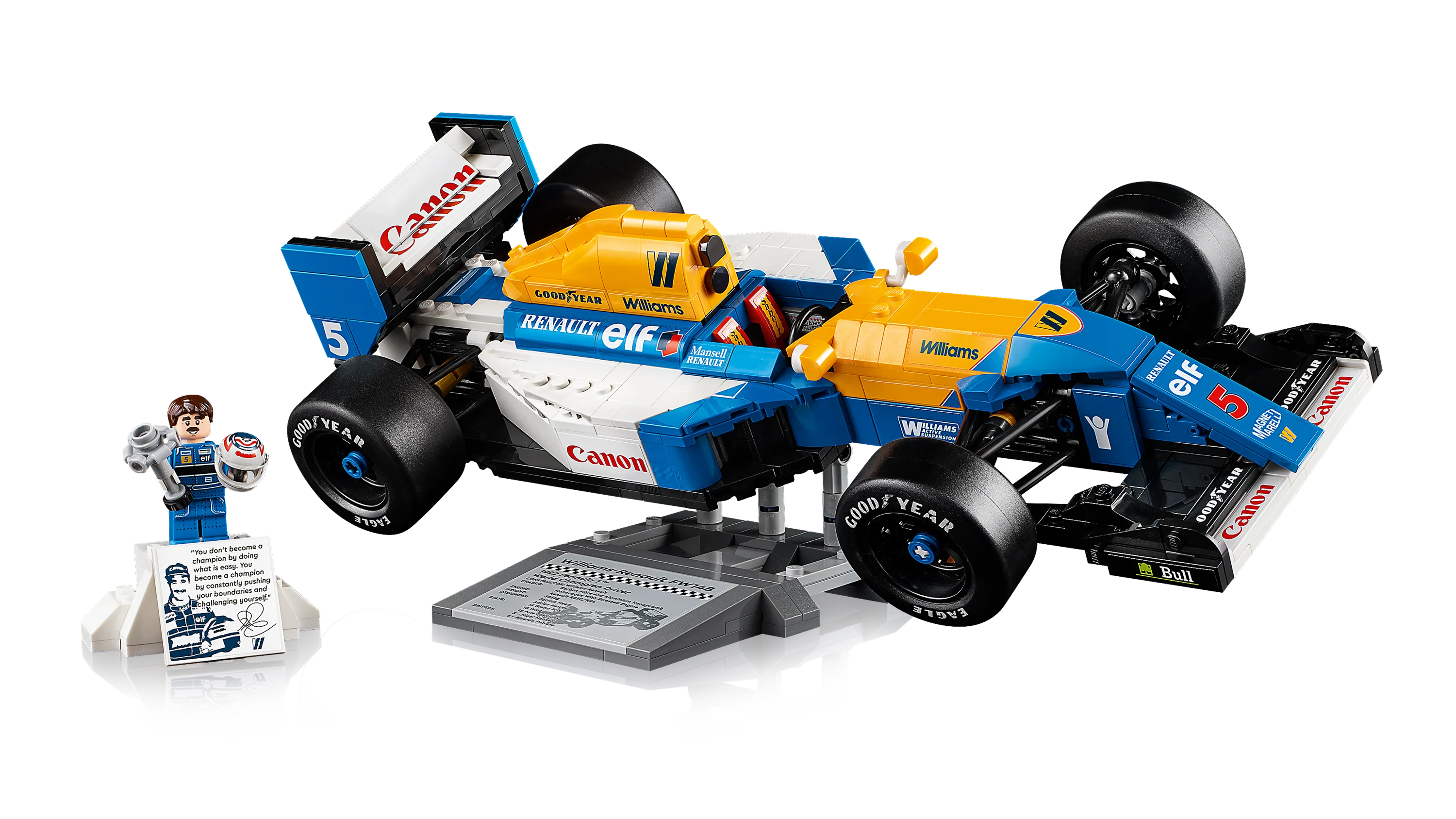 The LEGO Icons Williams FW14B features working steering, wide rear slick tyres with printed Goodyear lettering and a detailed engine, plus a display stand with vehicle details and stats. The Nigel Mansell minifigure comes with a helmet and a podium-style display stand featuring a photo and a quote from the legendary driver.