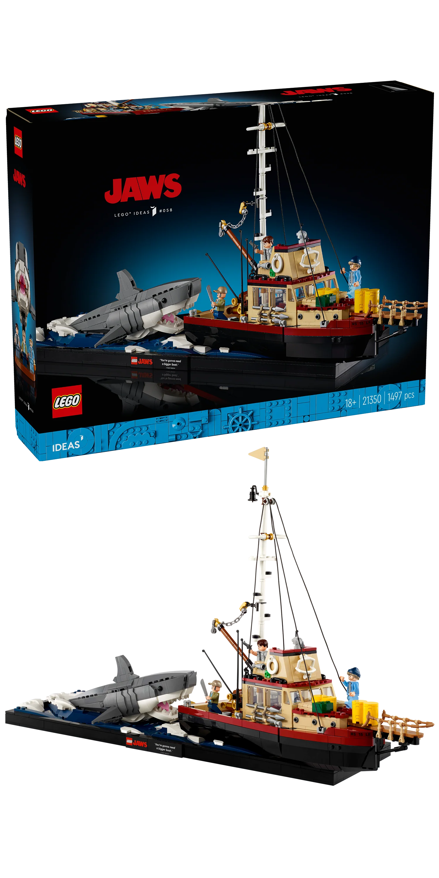 This collectible Jaws LEGO diorama set also includes 3 iconic characters – Chief Martin Brody, Matt Hooper and Sam Quint – plus an alternative display stand where the fully built Jaws shark figure can be displayed with the minifigures.